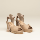 Felicia est une sandale espadrille à talon moyen, dotée de brides ouvertes, d’une fermeture à boucle et confectionnée en daim à la texture douce et contemporaine.