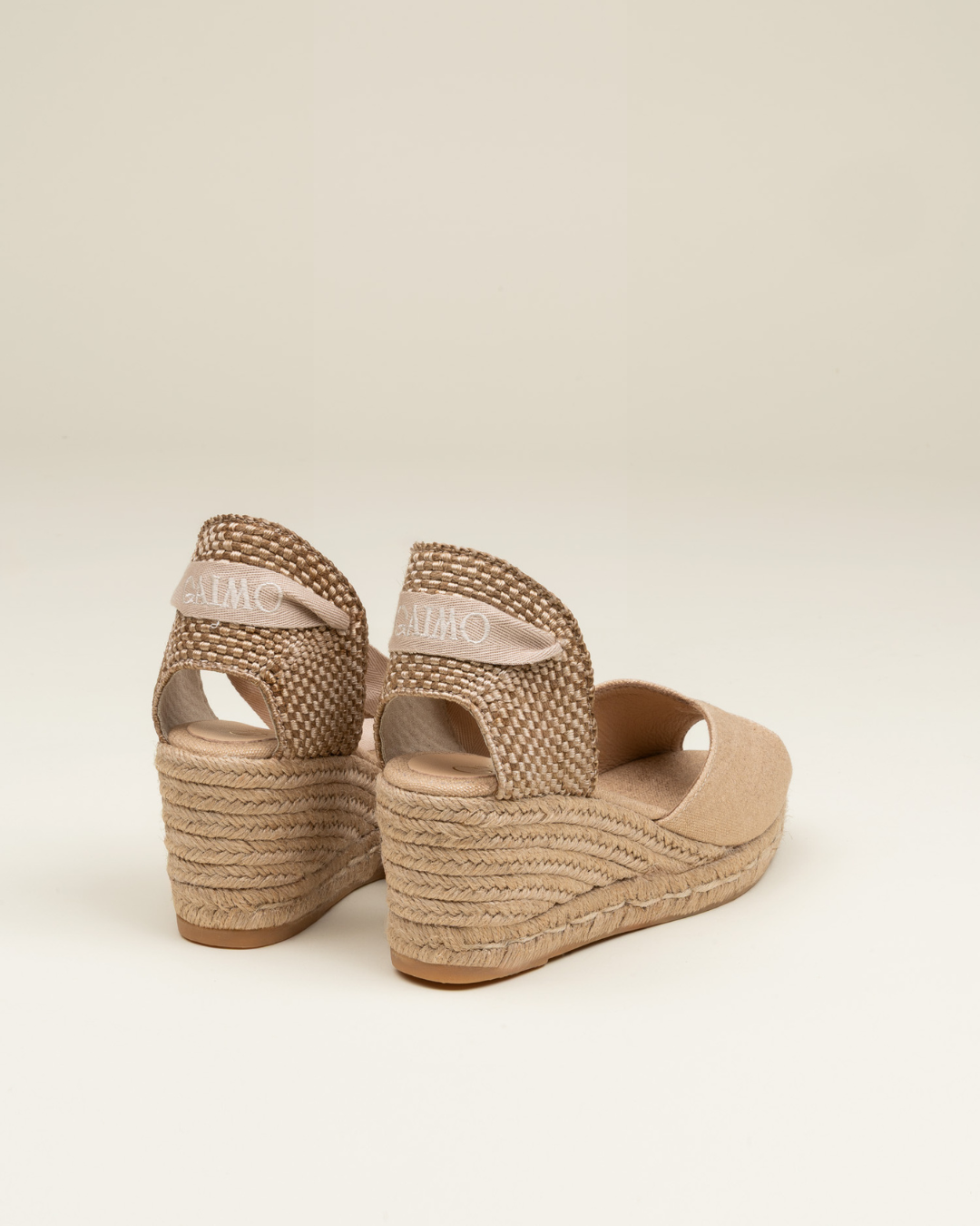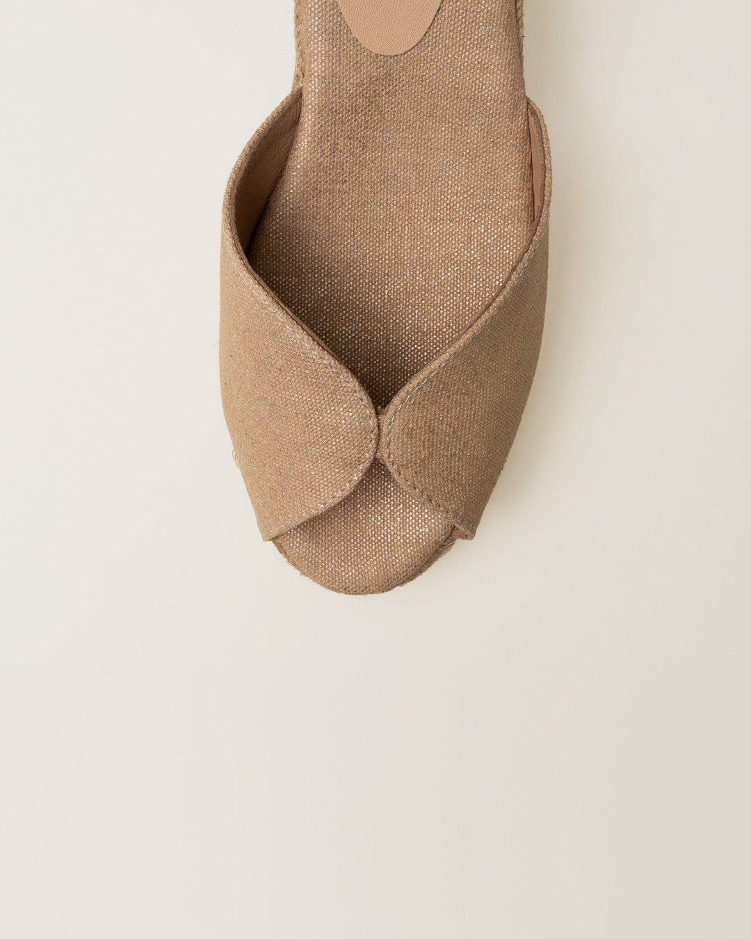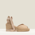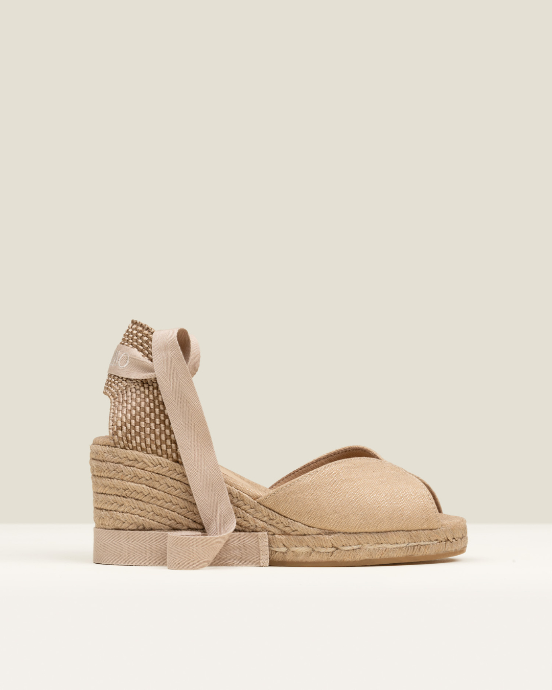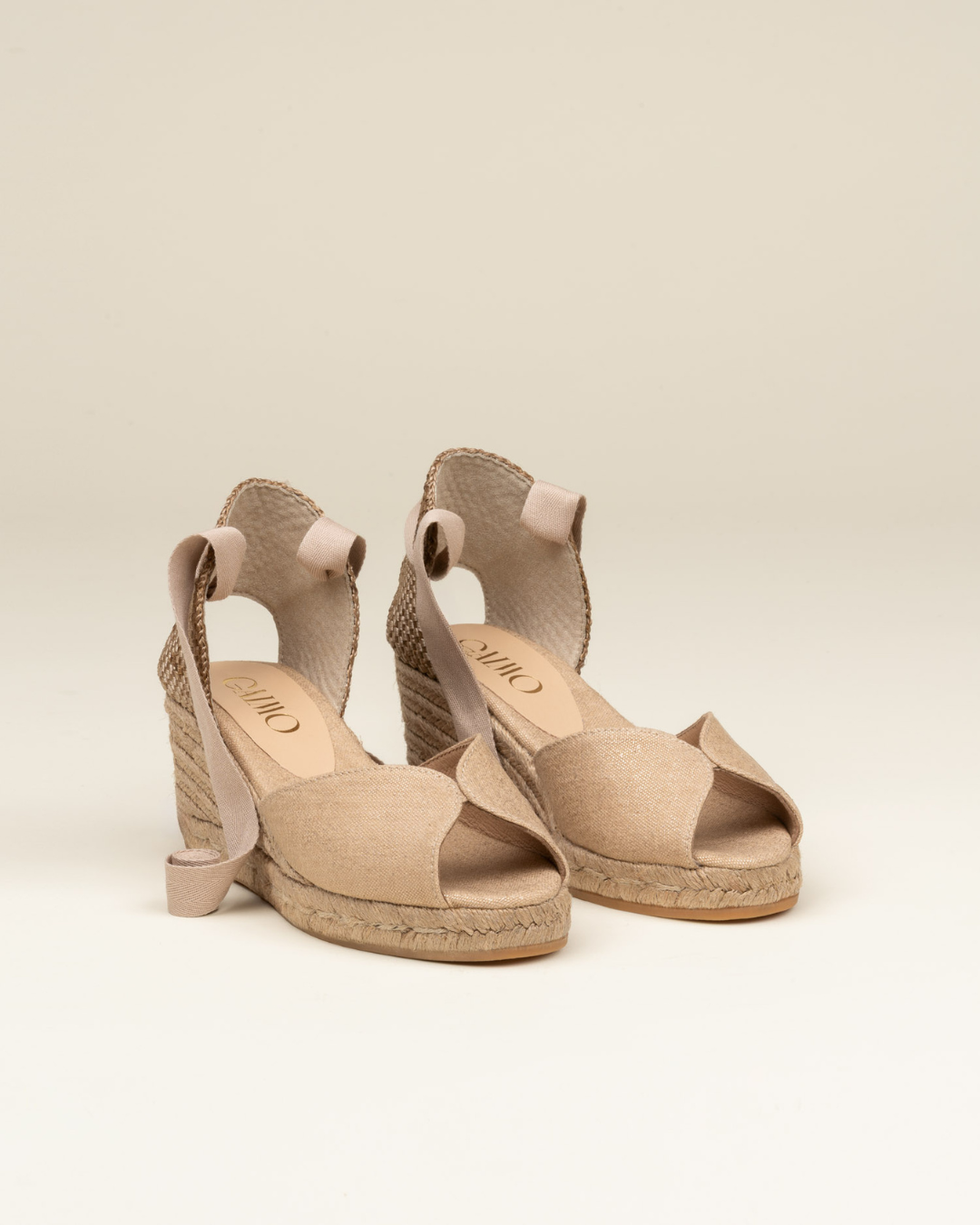 Raul est une espadrille compensée mi-haute au design ouvert, nouée à la cheville par des rubans et dotée d’un décolleté en forme de cœur qui crée une silhouette féminine et contemporaine.